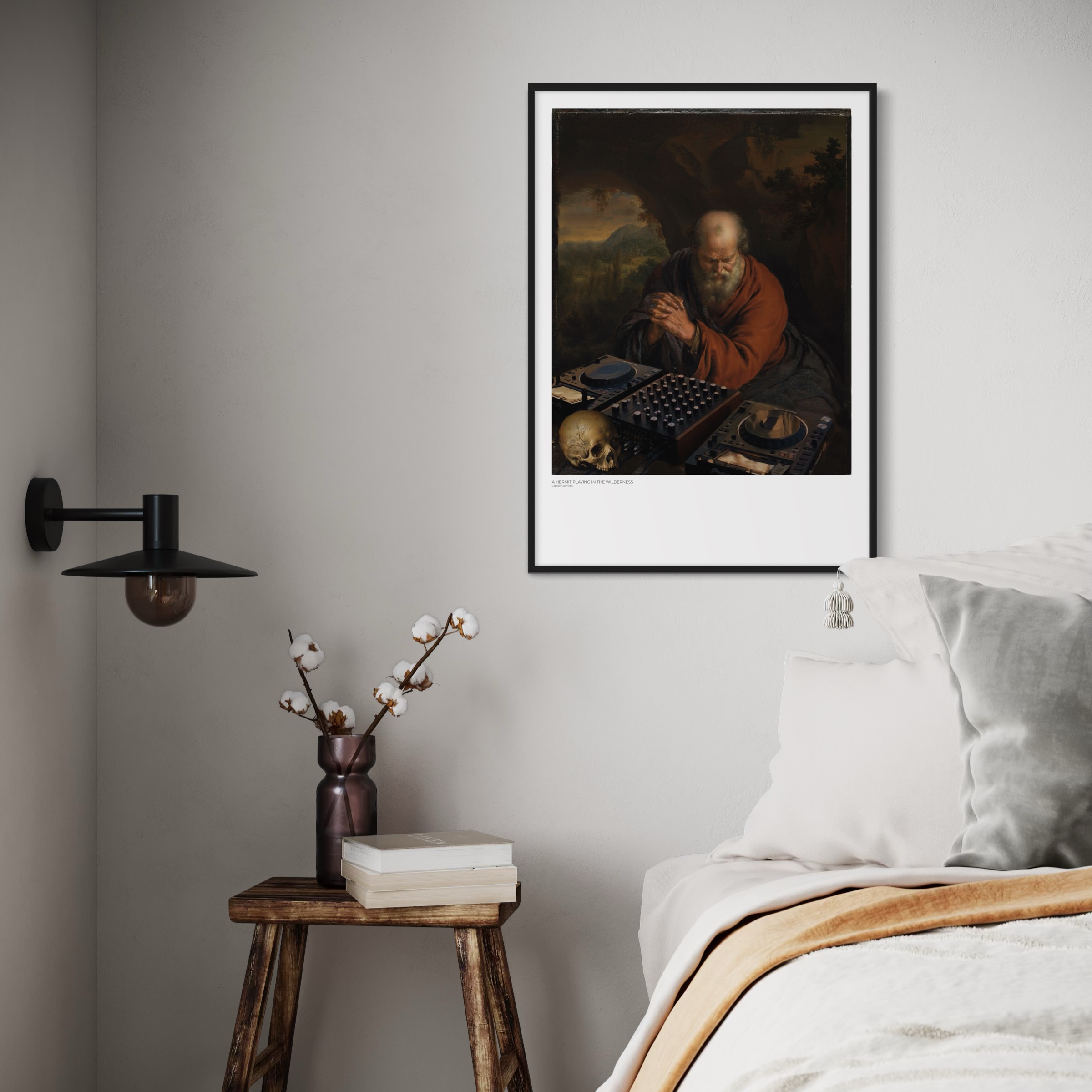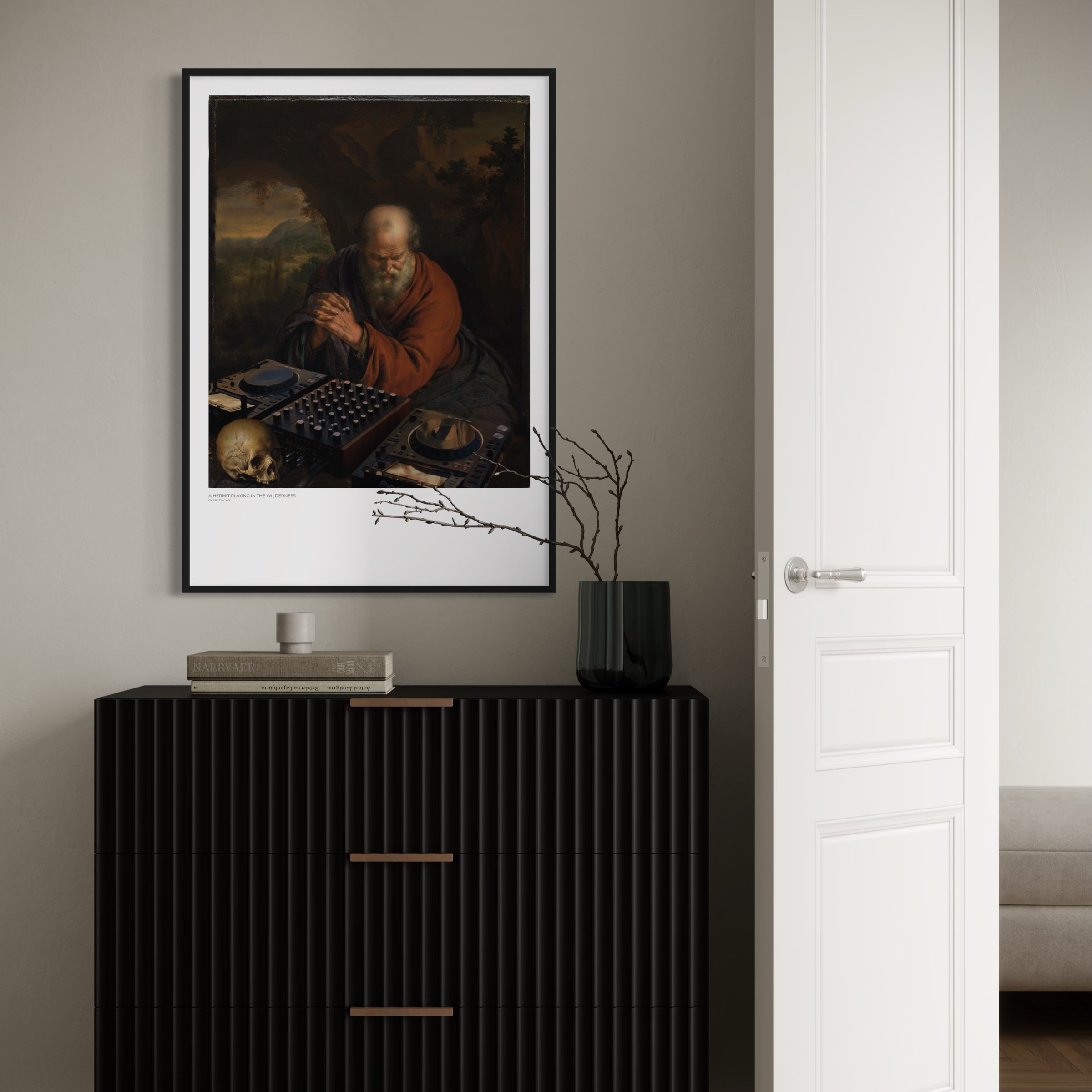 „A Hermit Playing in The Wilderness“ basiert auf einem Ölgemälde von Frans van Mieris aus dem Jahr 1665. Das Motiv zeigt einen Einsiedler, der sich in einer felsigen Höhle befindet, die sich zu einer bergigen Landschaft öffnet. Er beugt sich über ein DJ-Setup, auf dem ein Totenschädel liegt, und hält die Hände im Gebet.