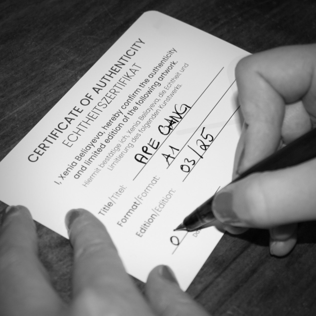 Ape Gang schwebt wie Nebel – weich, träumerisch, kaum greifbar. Ein Bild in Bewegung. Monochrom und still. Limitiert auf 25 Exemplare, gedruckt auf 310 g Hahnemühle FineArt Photo Rag.
