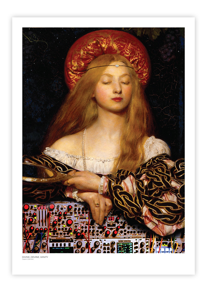 „Divine, Devine, Vanity“ basiert auf Frank Cadogan Cowpers Gemälde „Vanity“, dessen Bildsprache von der italienischen Renaissance beeinflusst ist. Cowper zeigt eine junge Frau, die mit Schmuck bedeckt ist und einen Handspiegel als Zeichen der Eitelkeit hält. Sie steht vor einer Weinrebe, die schwer von reifen Trauben hängt und auf Fülle und Genuss verweist.Obwohl das Motiv weltlich ist, erinnert die Haltung der Frau, die sich in Captain Cosmotics Bearbeitung an einen modularen Synthesizer lehnt, an Darstellungen der Madonna mit dem Kind aus der Renaissance. Diese Anspielung wird insbesondere in der modernisierten Version sichtbar.