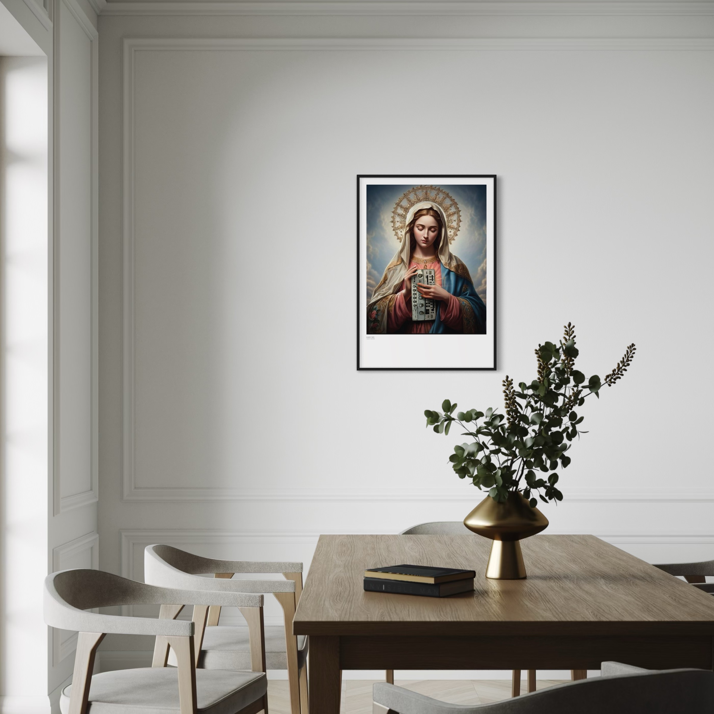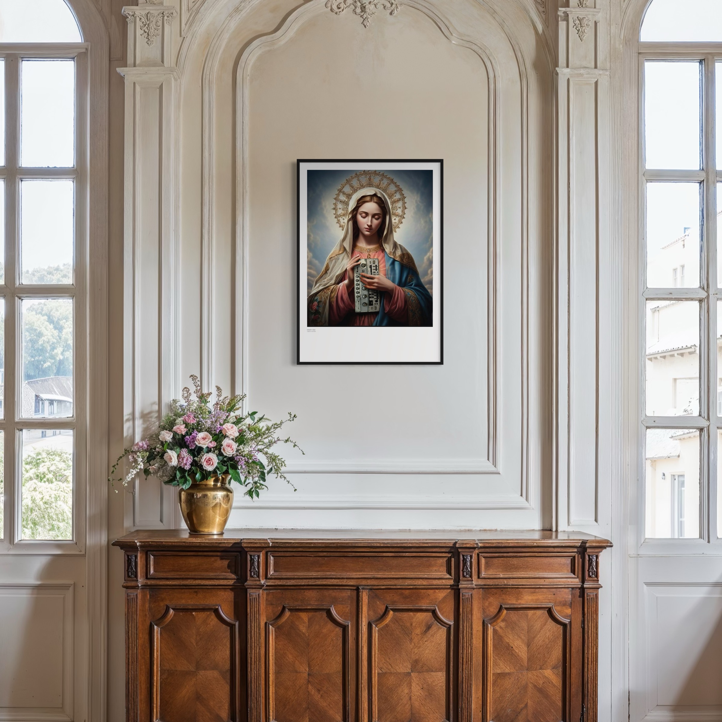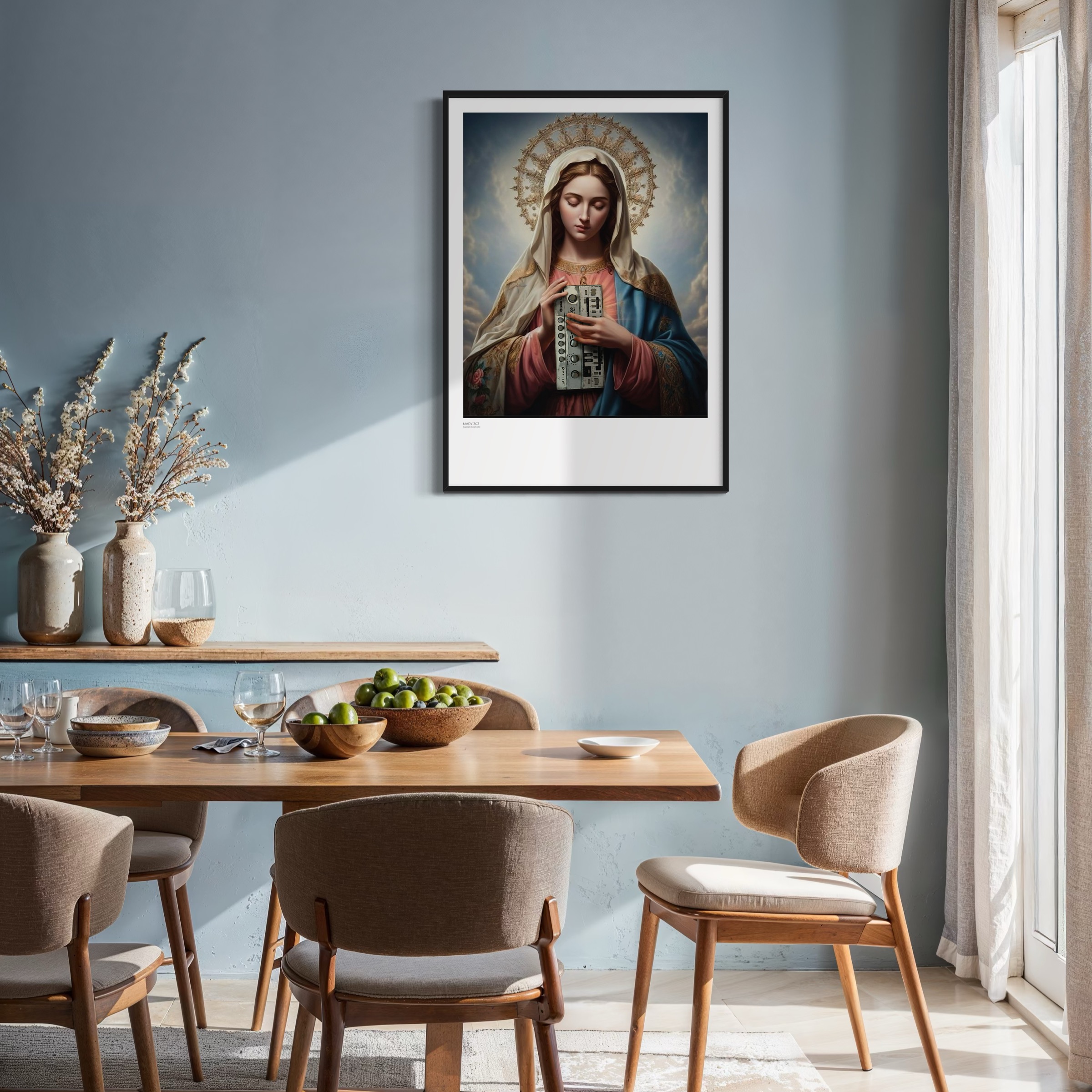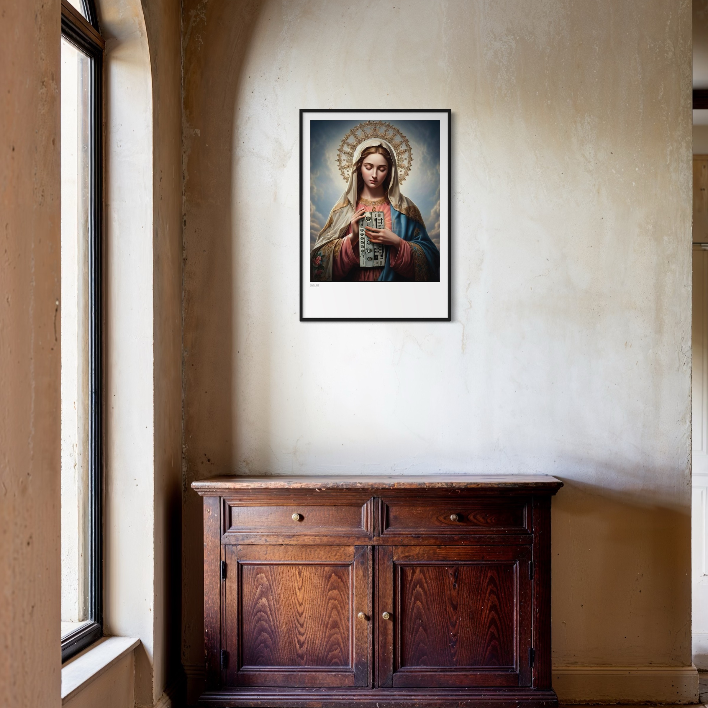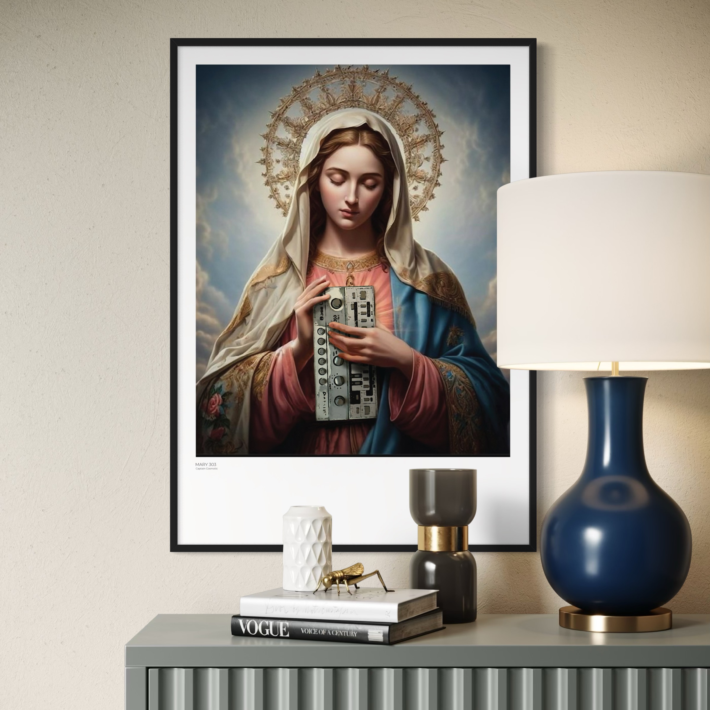 „Mary 303“ von Captain Cosmotic führt sakrale Bildtradition und elektronische Zukunftsvision zusammen. Maria wird mit klassischer Ruhe dargestellt. Der gesenkte Blick und der leuchtende Heiligenschein erinnern an zeitlose religiöse Ikonografie. In ihren Händen hält sie jedoch einen analogen Synthesizer, der das traditionelle sakrale Symbol durch ein Instrument moderner Klangschöpfung ersetzt.
