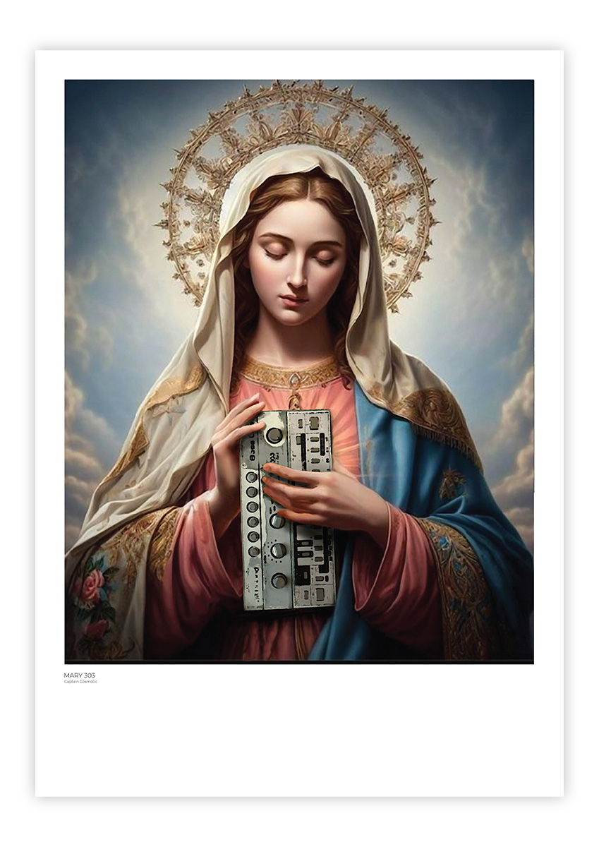 „Mary 303“ von Captain Cosmotic verbindet sakrale Tradition mit elektronischem Futurismus. Die Darstellung vereint klassische religiöse Bildsprache mit einem zeitgenössischen Instrument moderner Klangproduktion.
