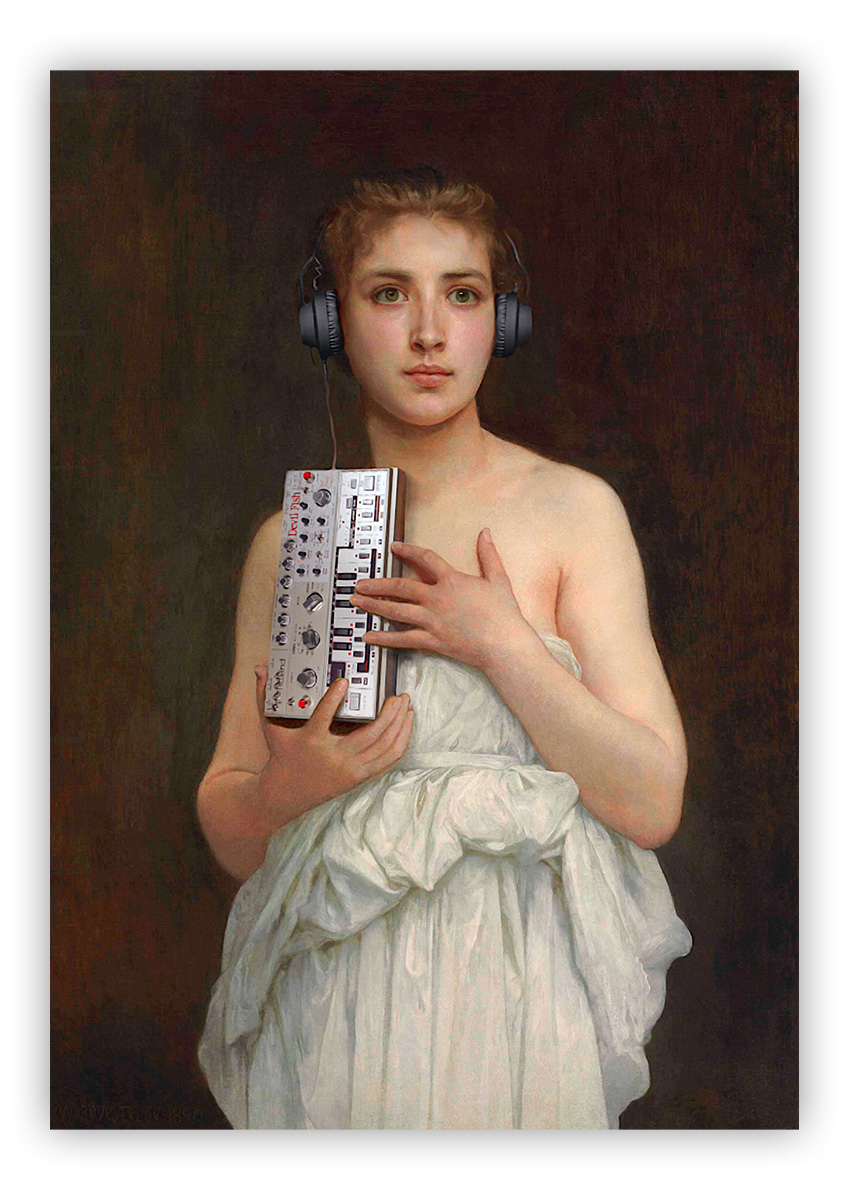 Pandora hat die 303-Box soeben geöffnet. Mit weit geöffneten Augen blickt sie in die Ferne auf die acidartigen Klangwellen, die sie gerade in die Welt entlassen hat. Eine Hand liegt klar ausgearbeitet an ihrer Brust, ihr Körper wirkt wie erstarrt angesichts der Unumkehrbarkeit ihrer Handlung.