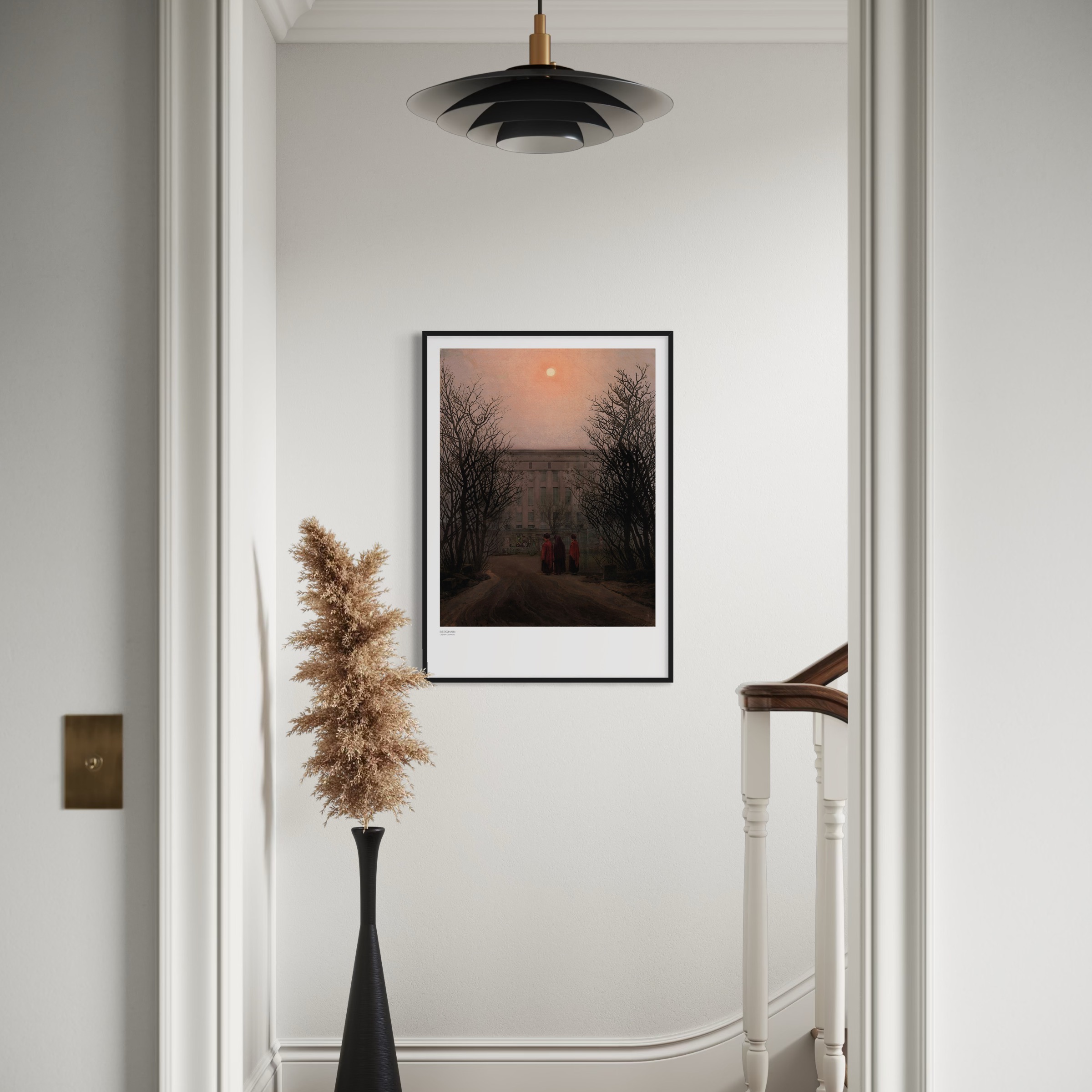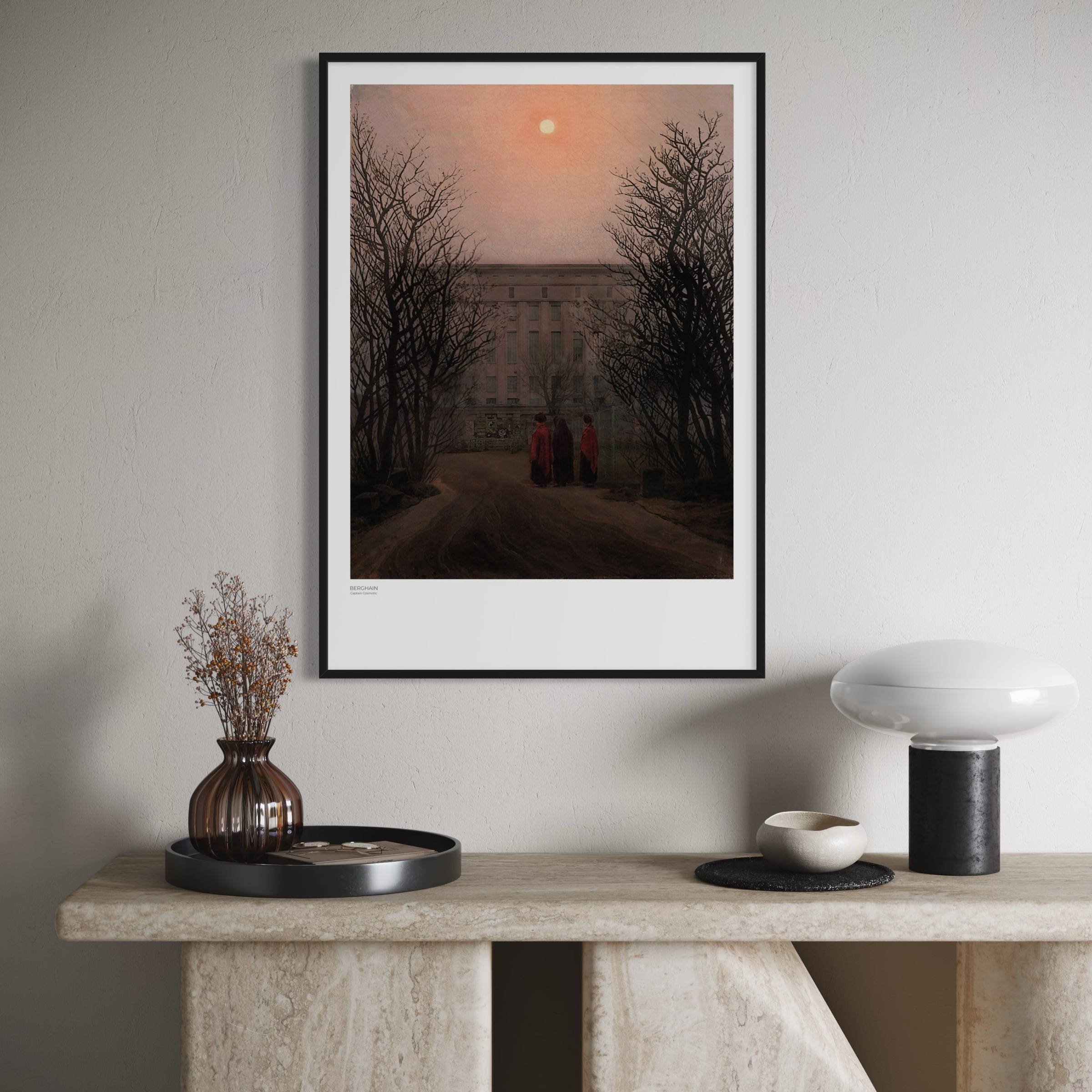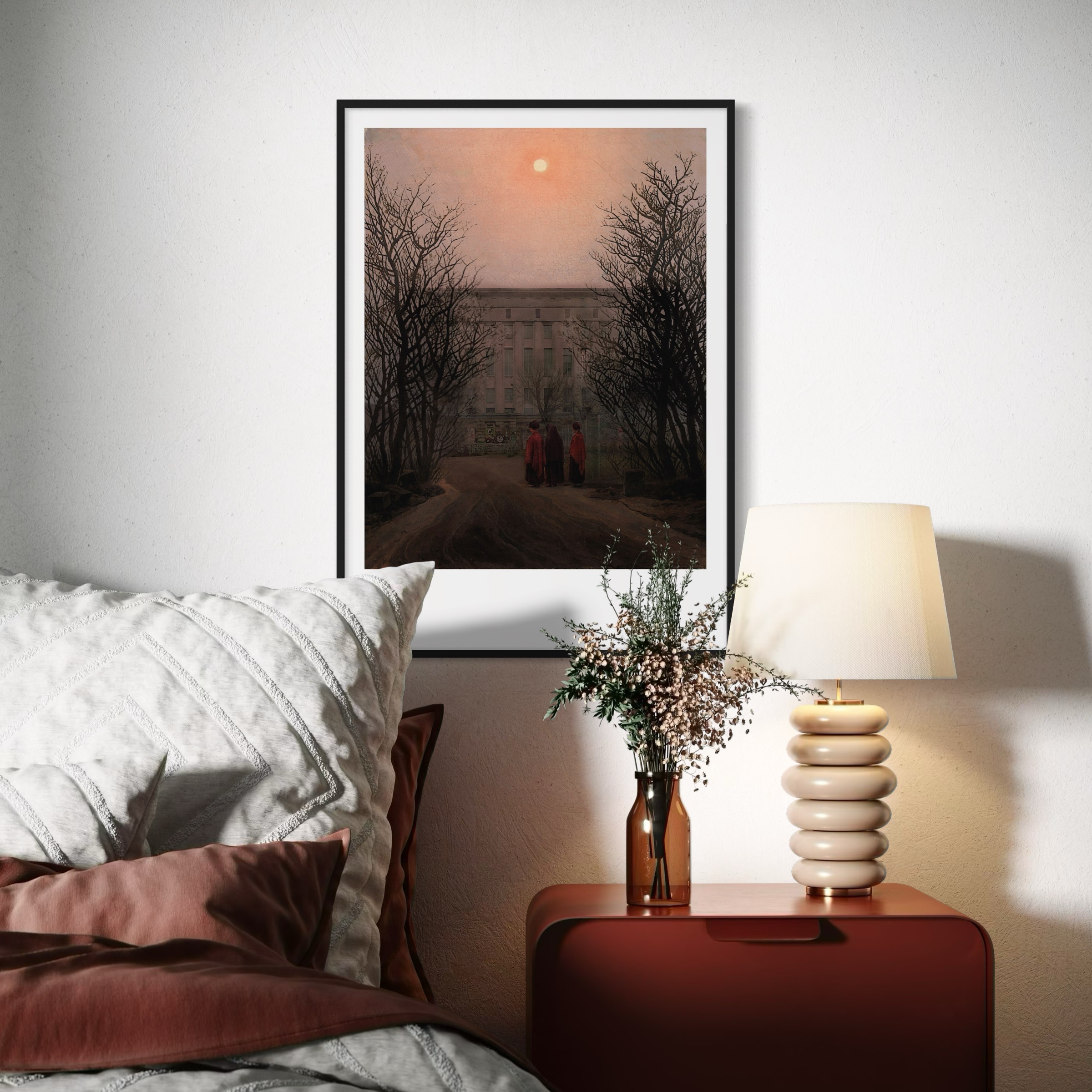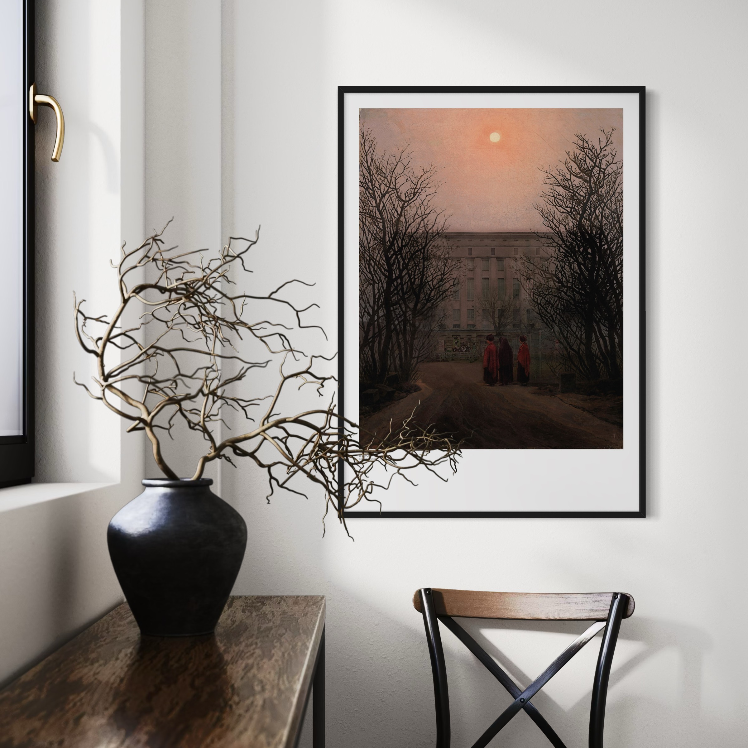 Am Horizont erhebt sich ein monumentales, strenges Gebäude, eingerahmt von kahlen Bäumen, die an Friedrichs wiederkehrende Motive von Einsamkeit und Innerlichkeit erinnern. Ein blasser Mond schwebt darüber und verweist auf das Unendliche und Spirituelle. Ein Weg führt den Blick ins Bild hinein und lädt zur Reflexion ein. An der Schwelle verweilen kleine, verhüllte Figuren, anonym und verletzlich, zwischen Ankunft und Aufbruch.