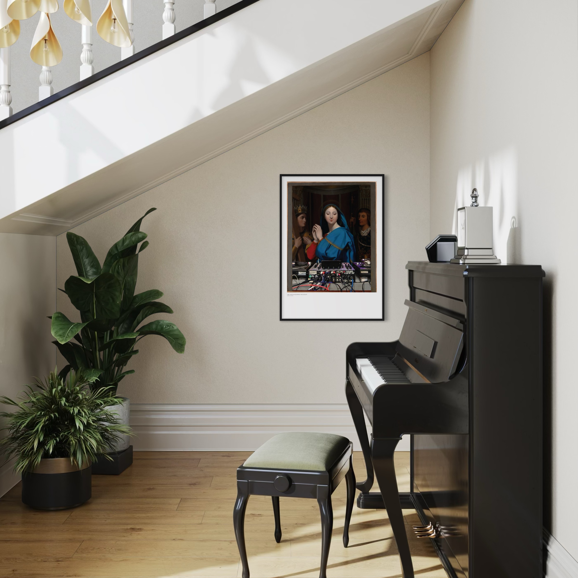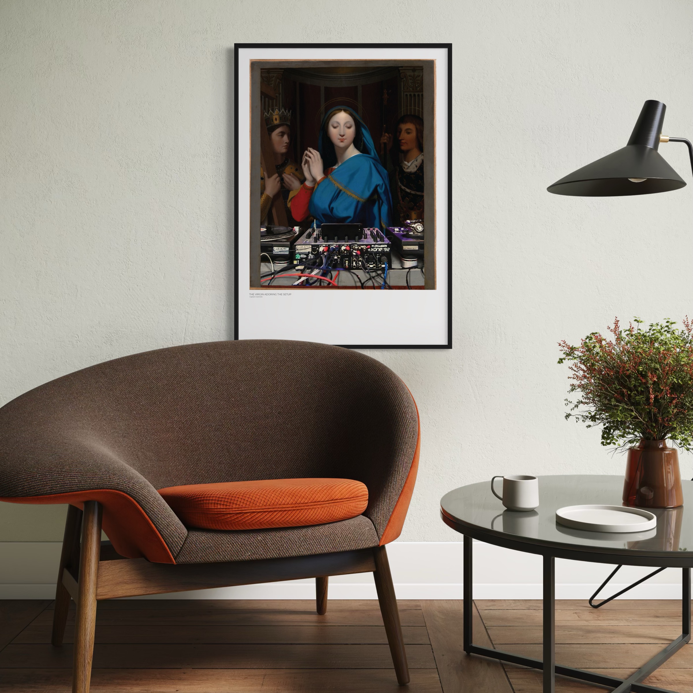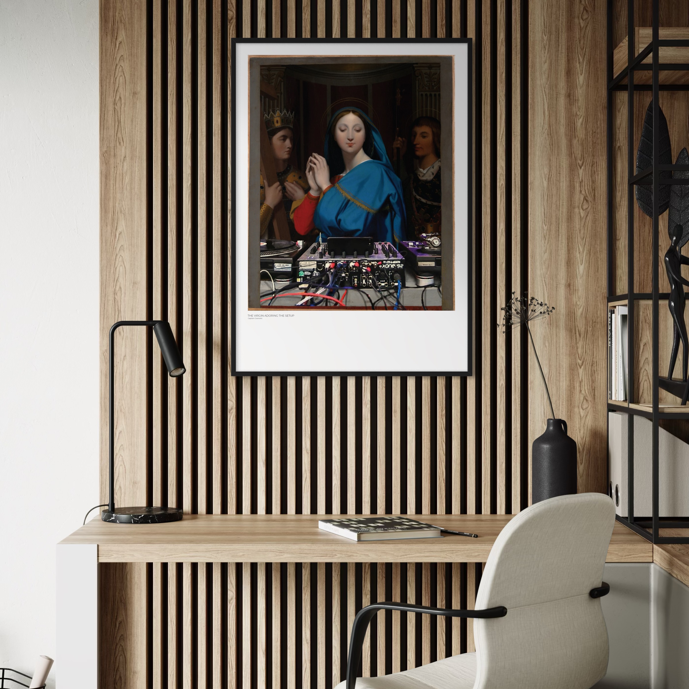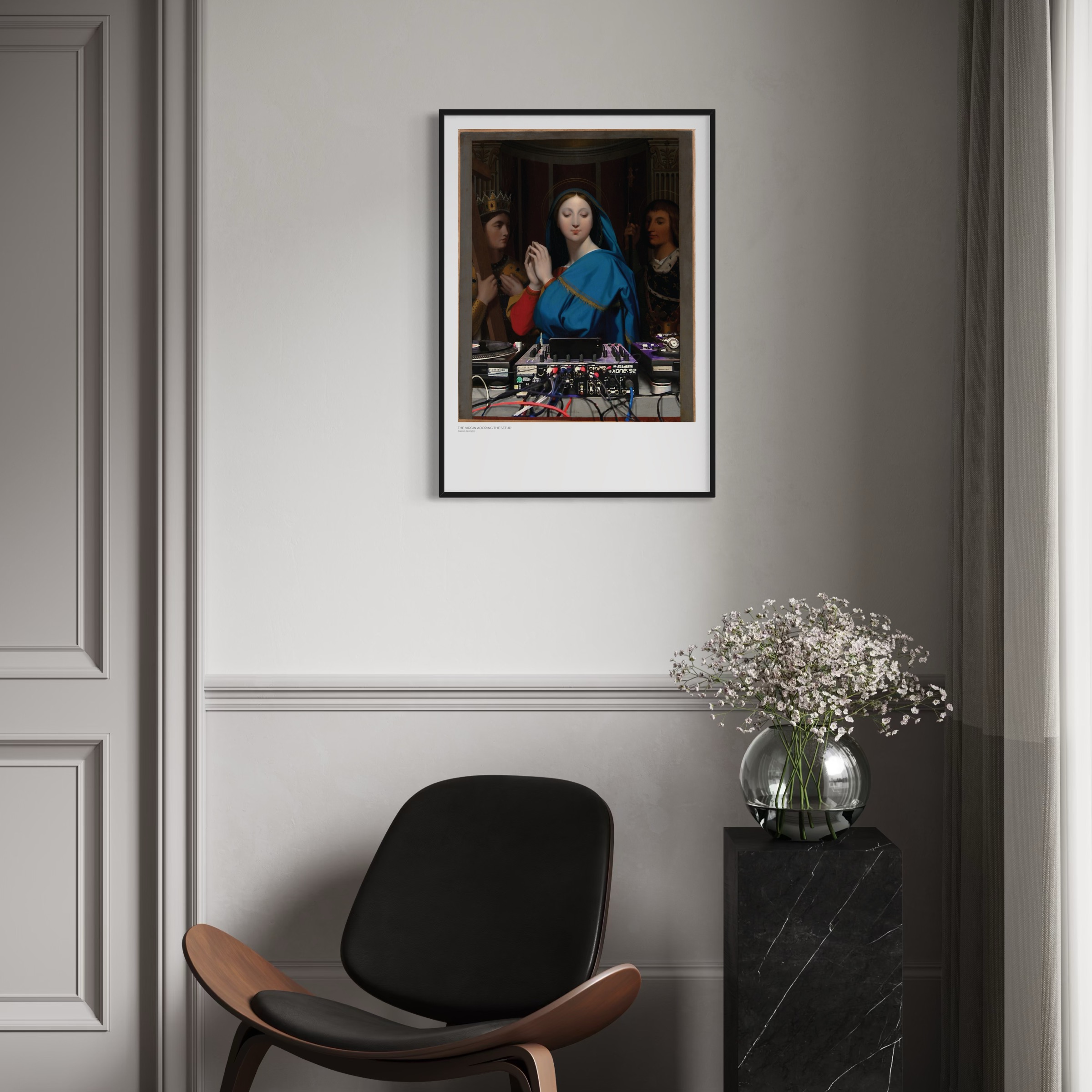 „The Virgin Adoring the Setup“ basiert auf Jean-Auguste-Dominique Ingres’ Gemälde „The Virgin Adoring the Host“ aus dem Jahr 1852. Das kleinformatige, devotional angelegte DJ-Gemälde wurde ursprünglich als Geschenk für Ingres’ Freundin Louise Marcotte geschaffen.
